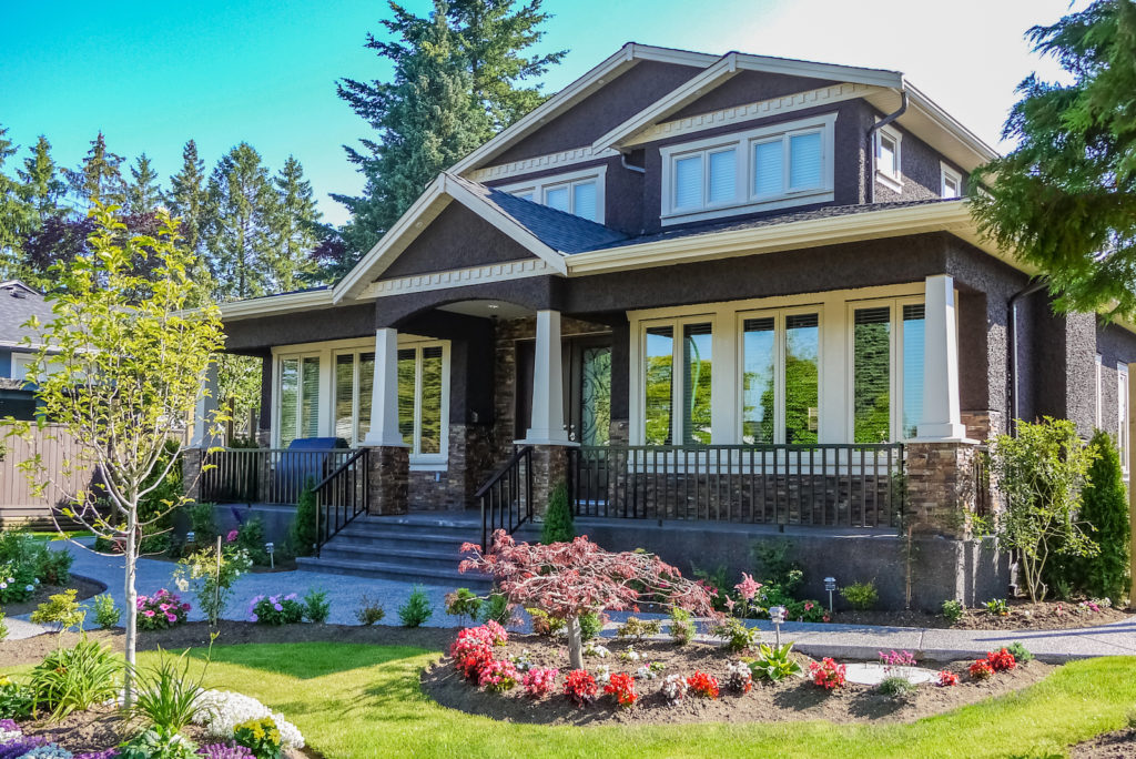 Main entrance of residential house with delicately landscaped front yard
